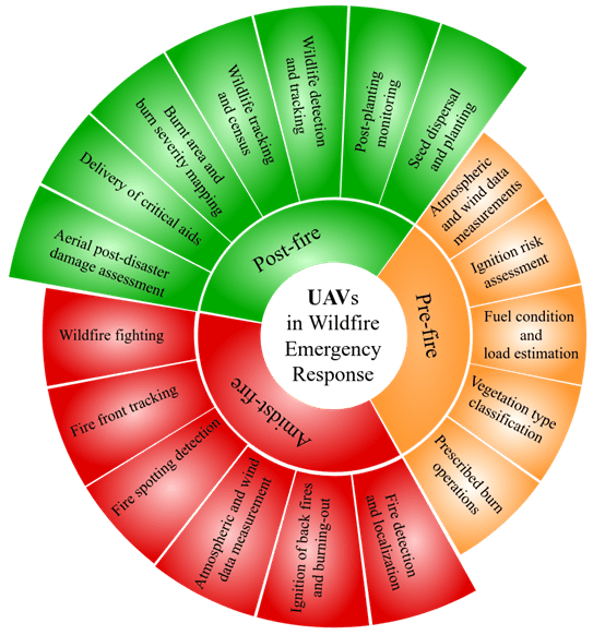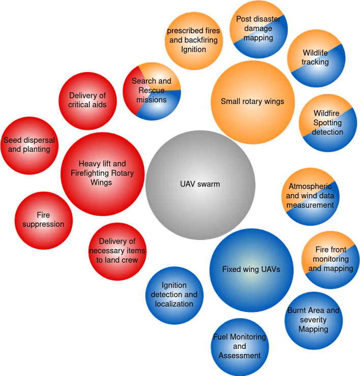 Bird’s eye view of envisioned wildfire emergency response system empowered by UAV swarms. Here, the UAV swarm is undertaking or supporting fire suppression operations and monitoring/tracking operations, while simultaneously gathering information to enhance the predictions of a physics-based fire propagation model.